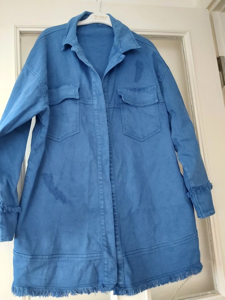 Mavi düğmeli, notalı yaka kadın denim ceket. Gevşek kesim, uzun kollu ve parlak yüzeyli, günlük sokak stiline uygun.