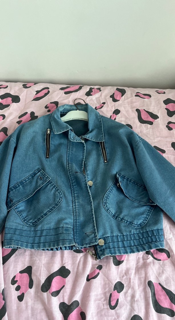 Mavi renkli, düğmeli ve geniş cepli kadın denim ceket. Notlu yakası ve askılı kolları ile rahat ve şık bir görünüm sunar.