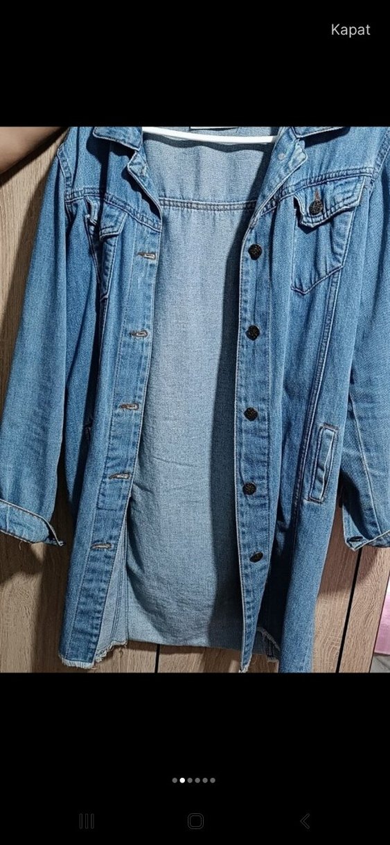 Mavi düğmeli kadın denim ceket, çıtçıtlı ve notalı yaka detaylıdır. Salaş kesim, uzun kollu ve midi boydadır, günlük sokak tarzına uygundur. Kumaşı parlak görünümlüdür.