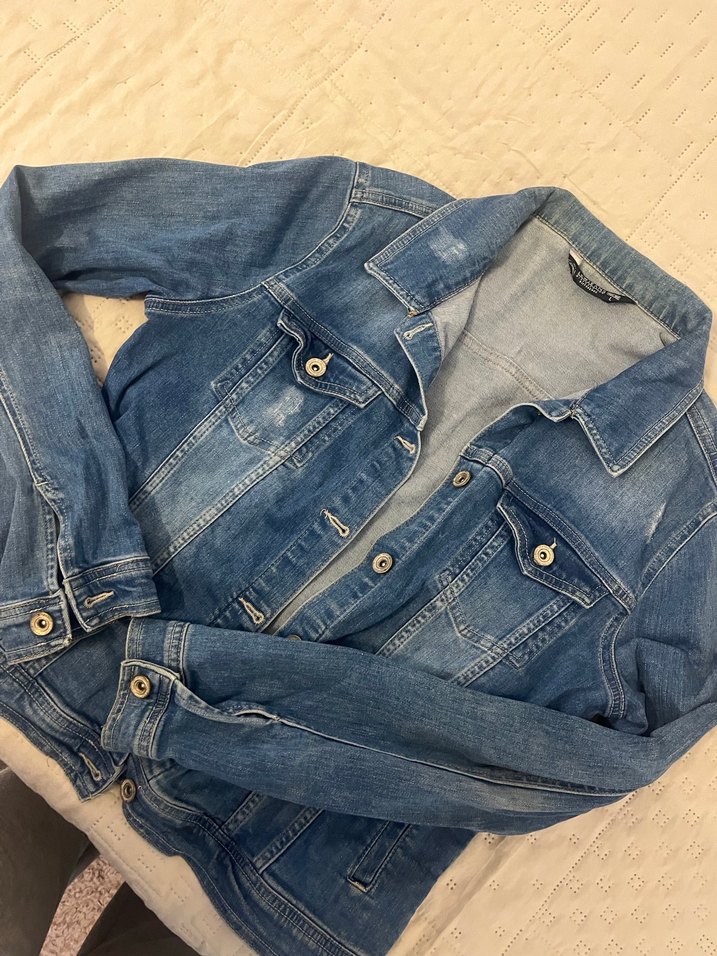 Mavi, parlak görünümlü, düğmeli, uzun kollu, normal boyda, salaş kesim kadın denim ceket. Sokak tarzına uygun, günlük kullanıma ideal.
