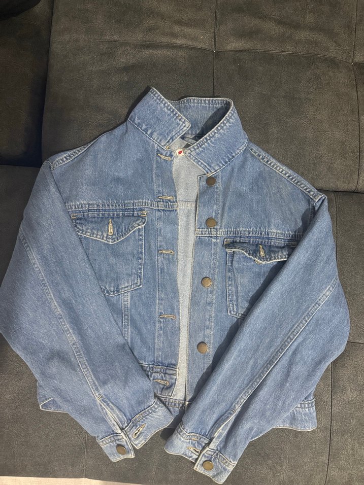 Mavi denim kumaştan, düğmeli, uzun kollu, bol kesim kadın ceket. Normal midi boyunda, notched yaka detaylı, günlük rahat kullanıma uygun.