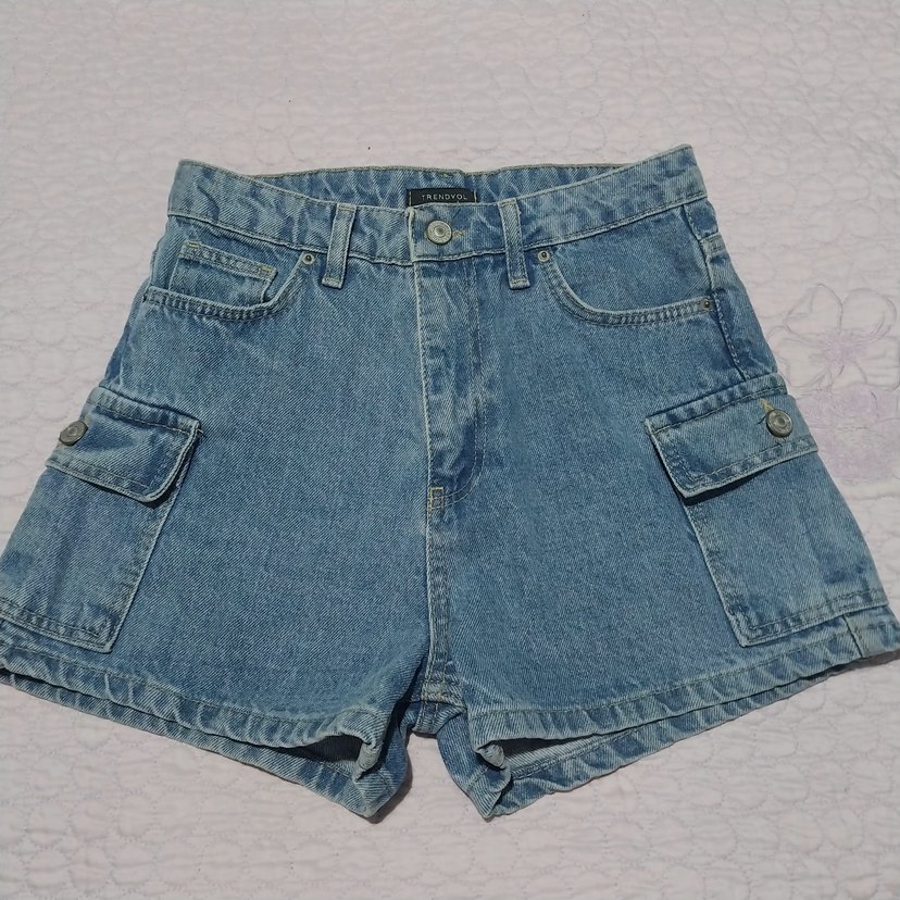 Düğmeli ve yan cepli, bol kesim mavi denim mini şort, rahat sokak stili için uygundur.