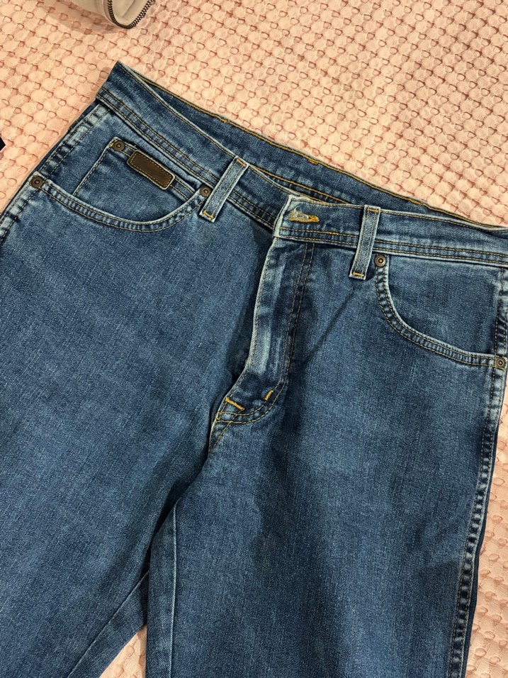 Mavi renkli, düğmeli, normal kesim kadın denim pantolon, günlük kullanıma uygun sade tasarım.