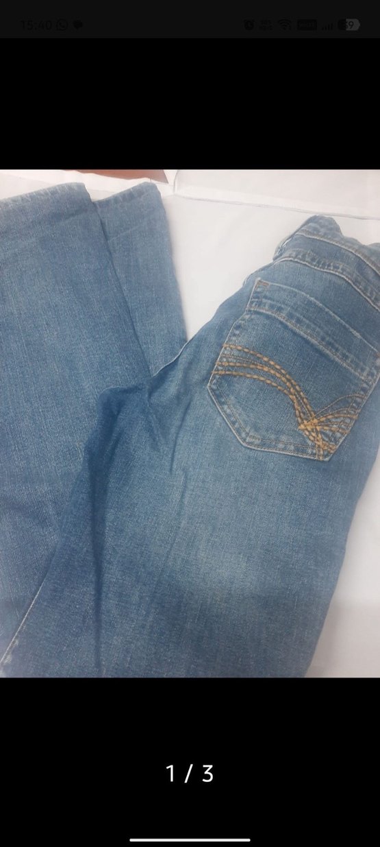 Mavi denim, düğmeli ve normal boyda kadın pantolon. Günlük kullanıma uygun, parlak görünümlü ve sade tasarımlı.