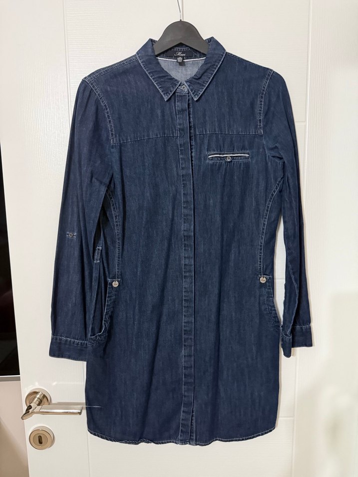Bu kadın denim tunik, bol kesim, uzun kollu ve kesik yaka detayına sahiptir. Düğmeli ön ve fermuarlı göğüs cebi bulunur. Lacivert tonlarında, midi boydadır.