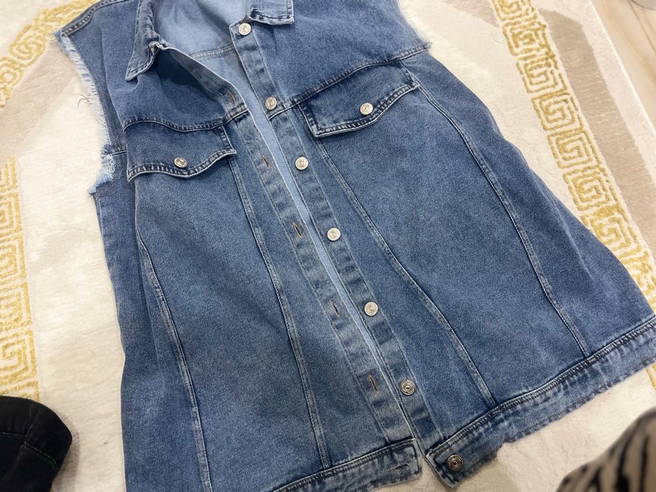Mavi renkli, düğmeli, cepli ve çıtçıtlı yakalı, normal kesim kadın denim yelek. Parlak görünümlü, gündelik sokak stili için uygundur.