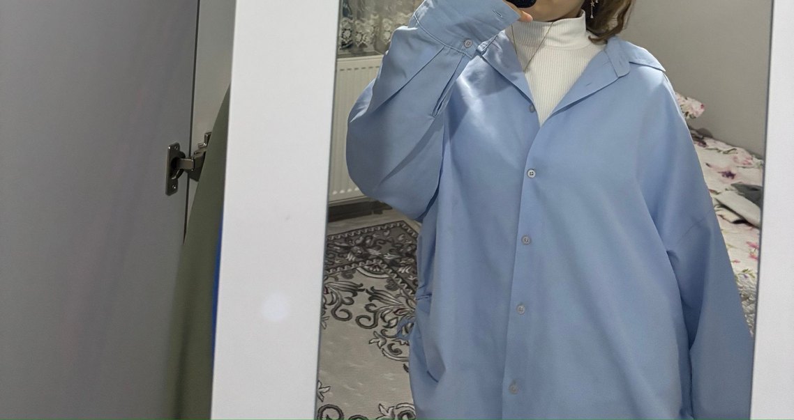 Düğmeli, yakalı ve uzun kollu kadın gömleği. Pastel mavi renkte, sentetik kumaştan, rahat kesimli ve iş ortamına uygun.