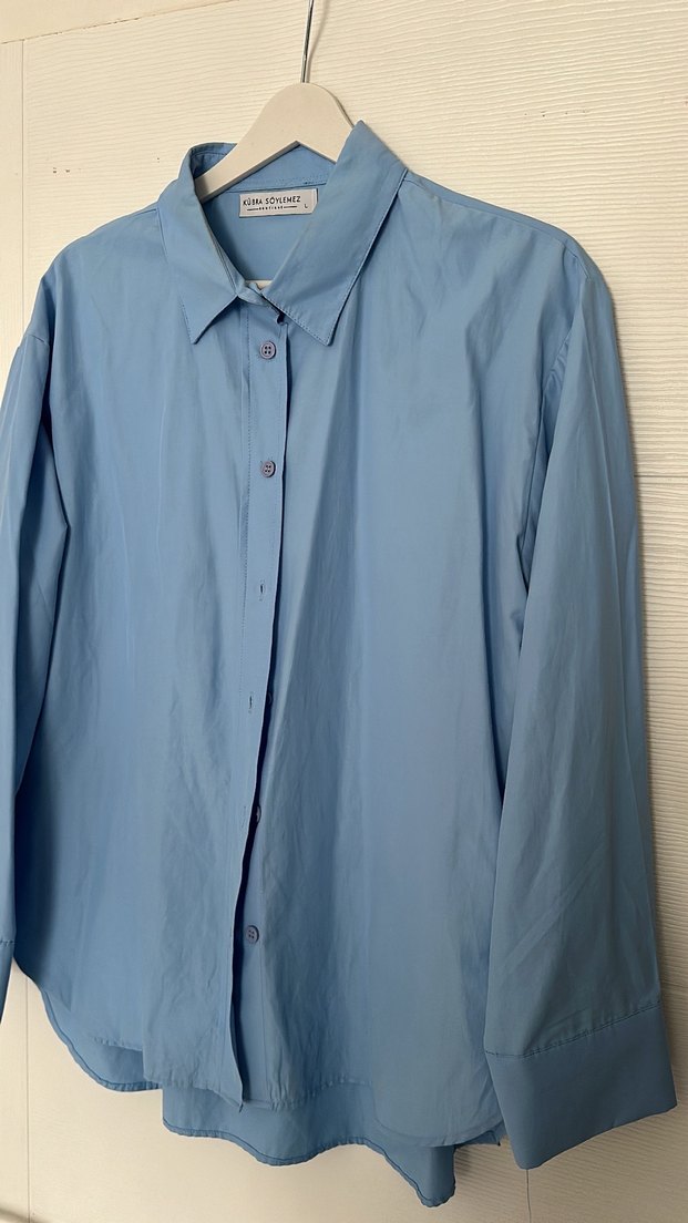 Mavi keten kumaştan, düğmeli, yakalı ve uzun kollu bol kesim gömlek. Ofis kullanıma uygundur.