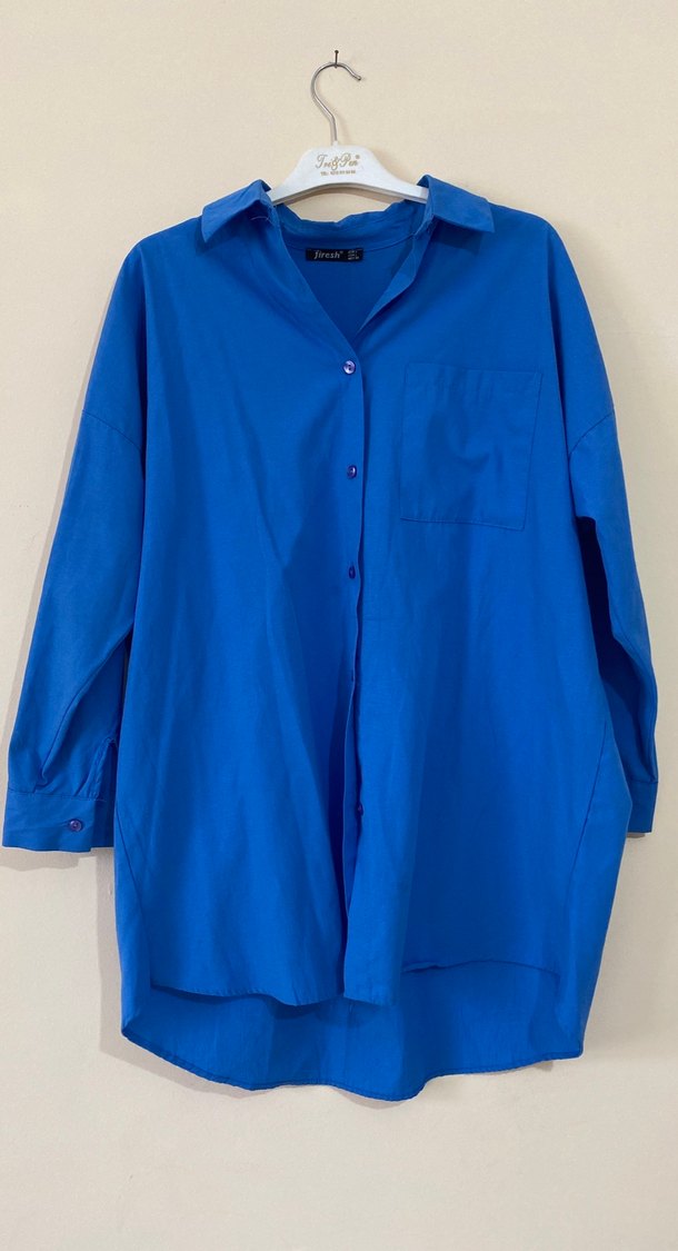 Parlak mavi renkli, yakalı ve uzun kollu kadın gömleği. Düğmeli, bol kesim ve sentetik dokulu kumaştan. Normal midi boyda, günlük sokak stili için uygundur.