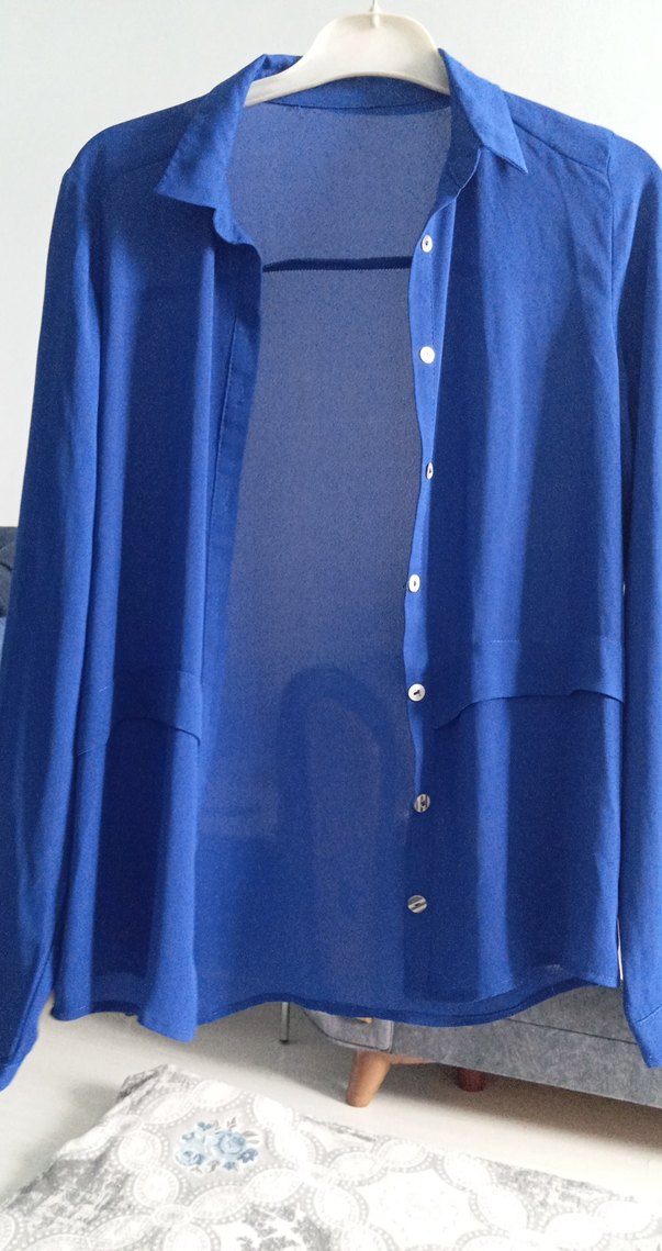 Parlak mavi kadın gömleği, yakalı ve düğmeli önde. Uzun kollu, bol kesim ve midi boyda, sentetik kumaştan. Günlük ve ofis kullanımı için uygundur.