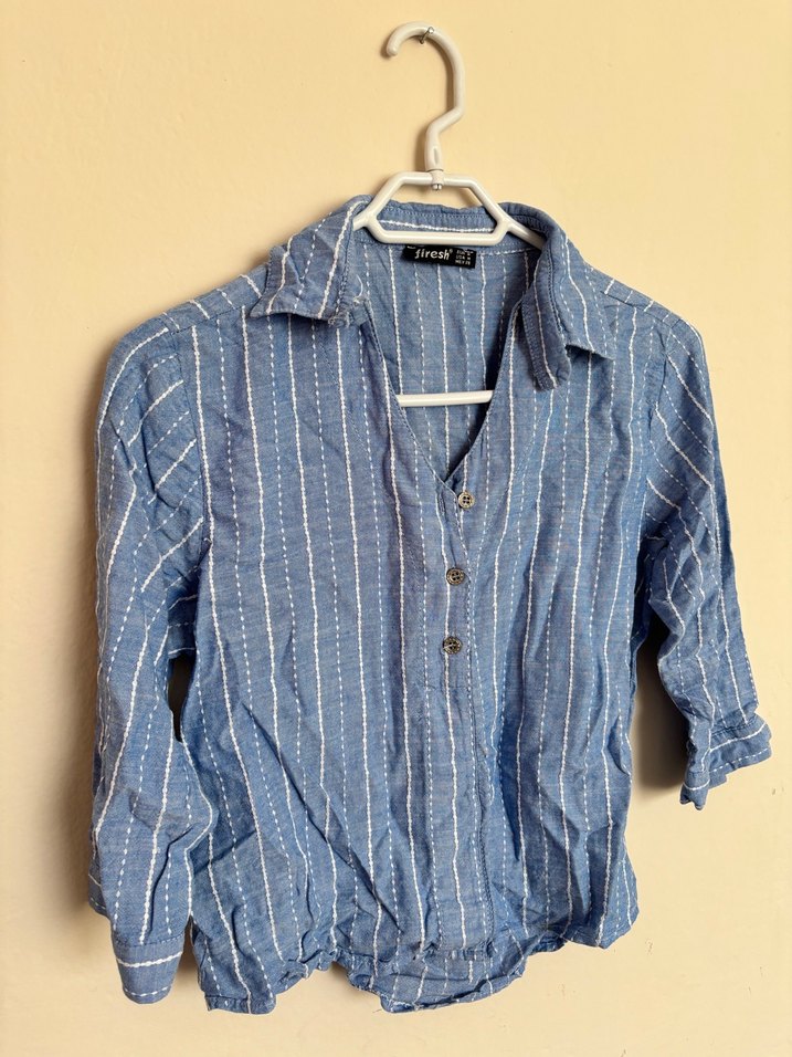 M Beden, mavi renk, düğmeli ve yakalı, kısa kollu, kısa-normal boyda, rahat kesim kadın gömlek. Günlük sokak stili için uygundur.