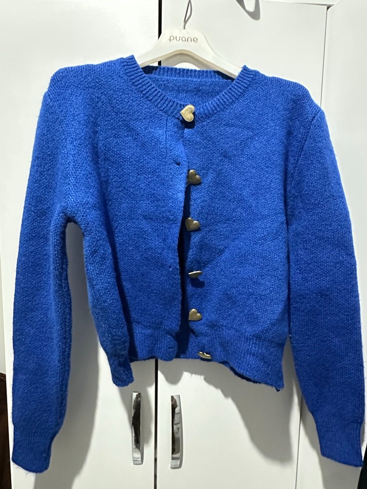 Mavi renkli, düğmeli ve yuvarlak yakalı kadın hırka. Uzun kollu, vücuda oturan ve normal boyda, rahat bir his sunar. ❤️