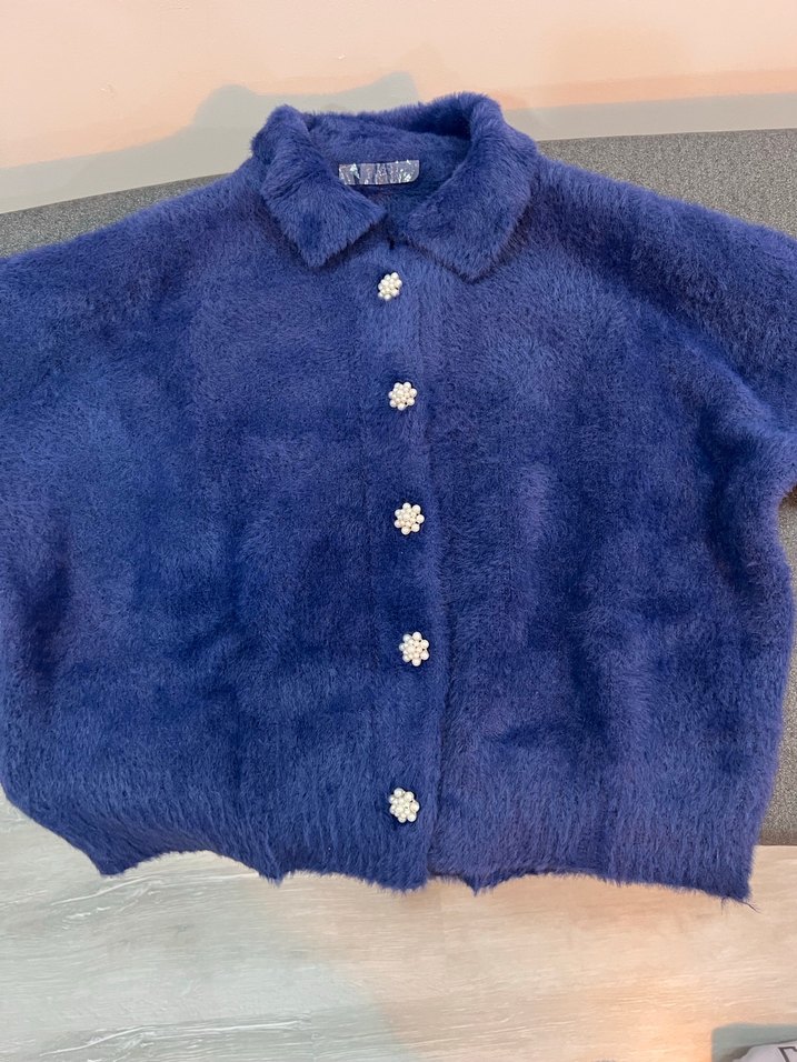 Mavi renkte, düğmeli ve yakalı, uzun kollu, yumuşak ve sıcak kumaştan, rahat kesimli günlük kullanıma uygun kadın hırka.