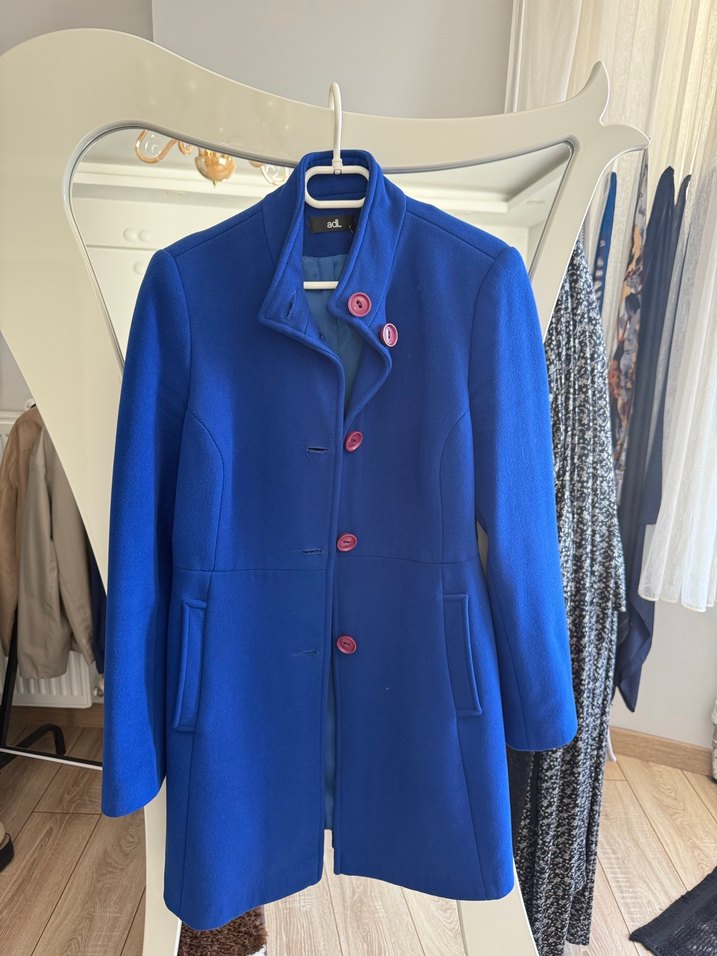 Mavi renkte, düğmeli ve yan cepli kadın kaban. Yüksek yakası ve dar kesimi ile şık bir görünüm sağlar.