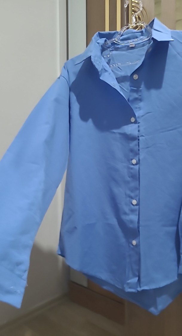 Düğmeli önü ve yakalı kesimiyle, yumuşak keten kumaştan üretilmiş kadın gömleği. Uzun kollu, normal kesim ve pastel mavide sade tasarım, günlük kullanım için uygundur.
