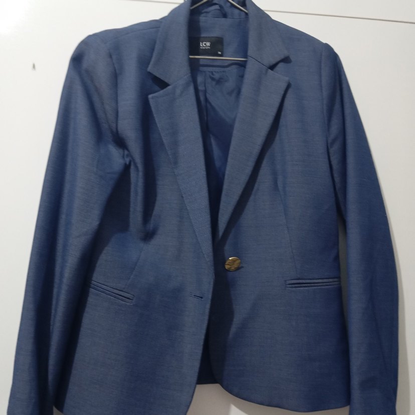 Mavi kot kumaştan, düğmeli, uzun kollu, normal boyda, kesimi rahat kadın blazer ceket. Parlak dokusu ve klasik yaka detayıyla ofis için uygundur.
