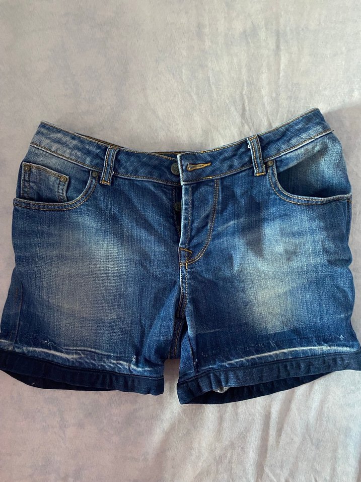 Mavi renkli, düğmeli kısa kot şort. Parlak görünüme sahip, desensiz ve günlük rahat sokak stili için uygun.