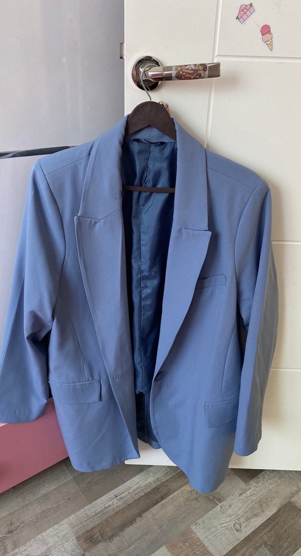 Pastel mavi midi blazer, kesik yaka ve uzun kollu. Düğmeli ön kısmı ve sentetik dokusu ile ofis için uygun, rahat kalıp.
