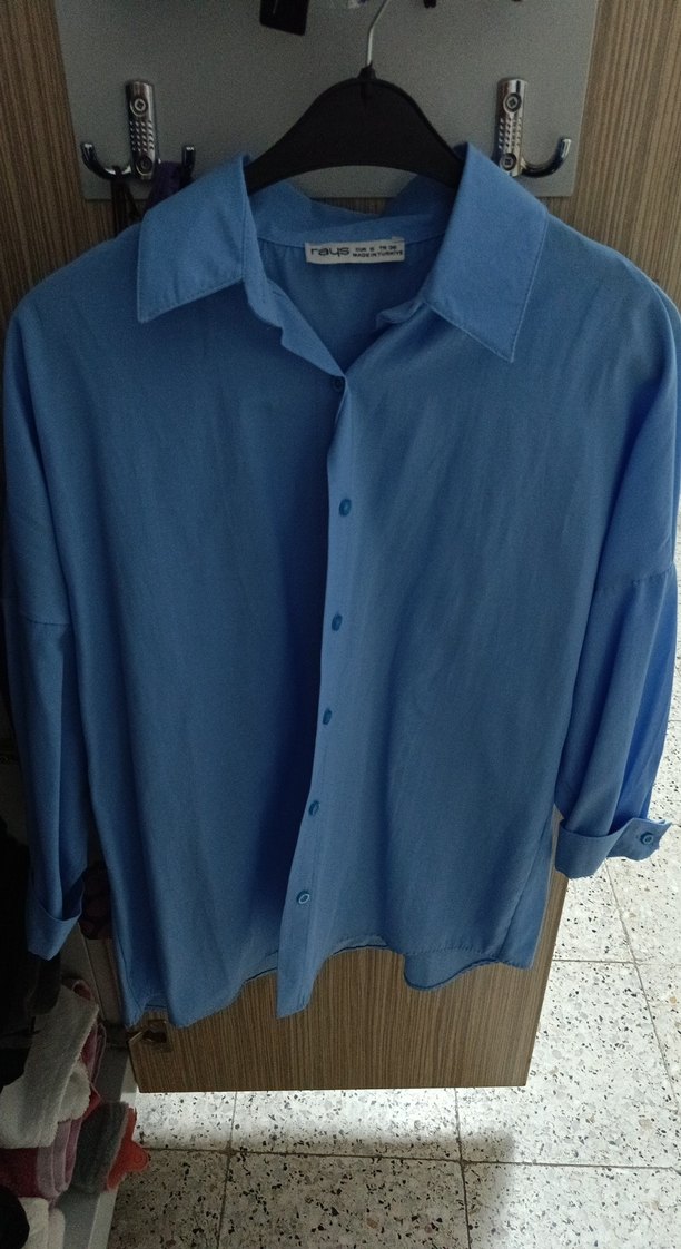 Mavi pastel tonlarda, düğmeli ve uzun kollu, yakalı, midi uzunlukta, rahat kesim kadın gömleği. Yumuşak ve parlak kumaştan, günlük ve sokak stiline uygun.