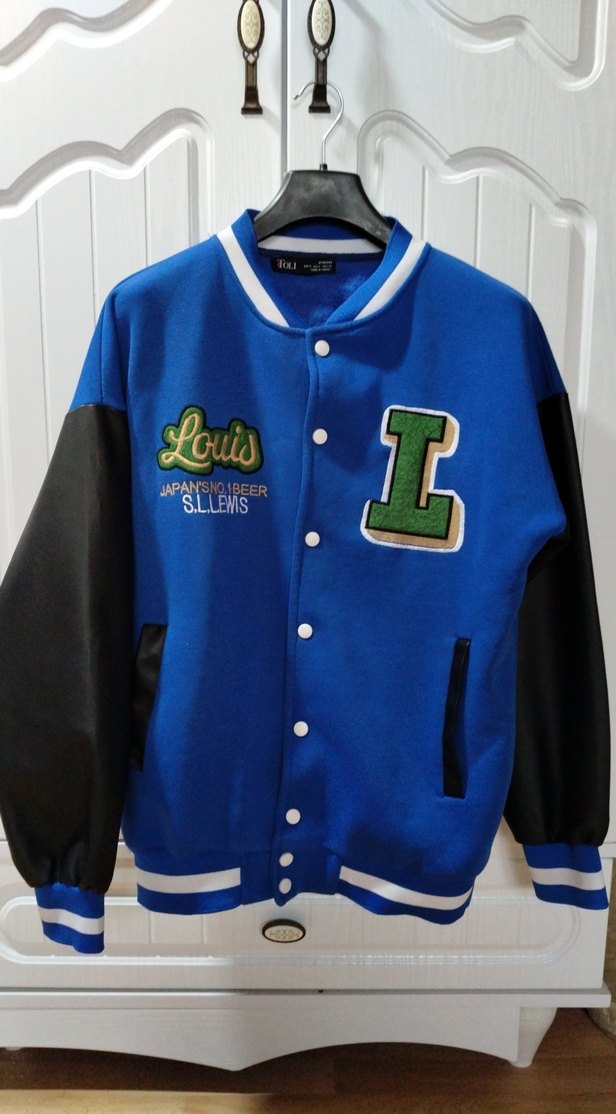 Düğmeli, uzun kollu ve bisiklet yaka kadın ceket. Mavi ve siyah renklerle, 'Louis' baskılı, bol kesim ve normal boyda sportif tarzda.
