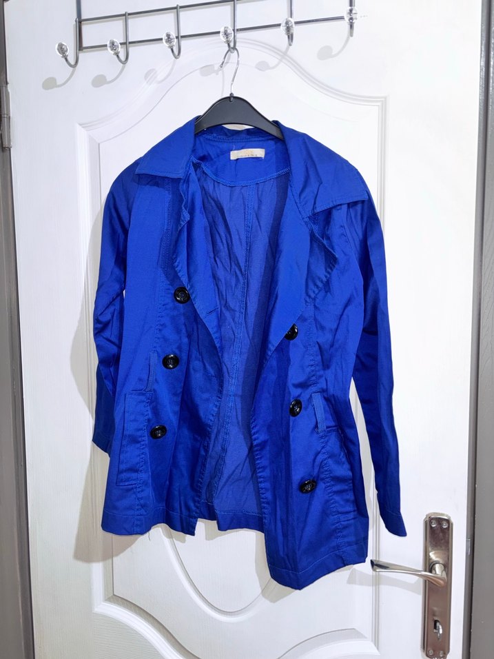 Resim de göründüğü gibi açık mavi değil koyudur rengi Mavi renkli, düğmeli, yakalı, uzun kollu ve bol kesim kadın trençkot. Keten kumaştan, parlak görünümlü ve midi boyda, günlük kullanım için uygun.