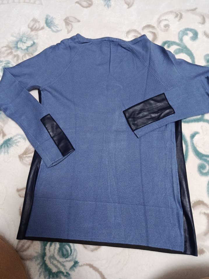 Mavi, uzun kollu, düğmeli ve siyah detaylı kadın triko sweatshirt. Yumuşak sentetik kumaştan, günlük rahat kullanım için uygundur.