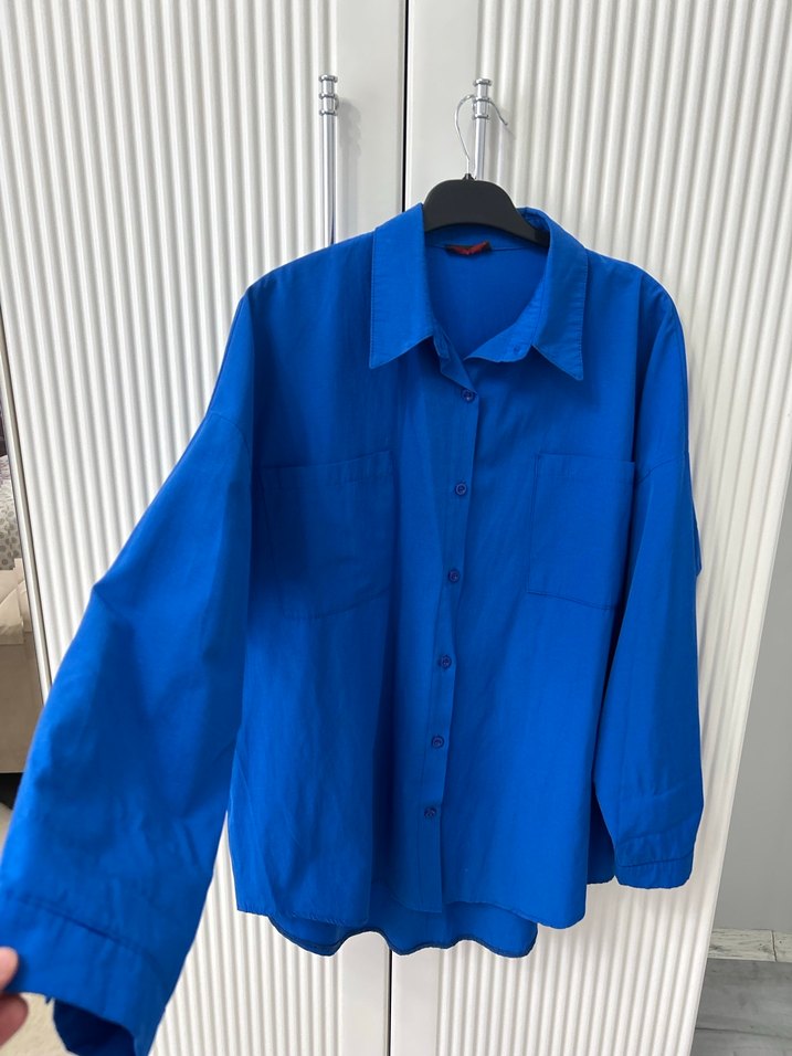 Mavi renkli keten gömlek, düğmeli ön, yakalı ve uzun kolludur. Salaş kesime sahip, parlak dokulu ve midi boydadır. Günlük kullanım için uygundur.