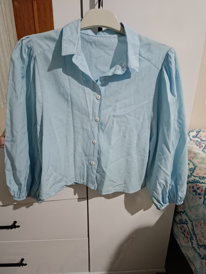 Pastel mavi keten kumaştan, uzun kollu ve düğmeli, yakalı, salaş kesim kadın gömlek. Günlük kullanım için uygun, desensiz ve rahat tasarım.