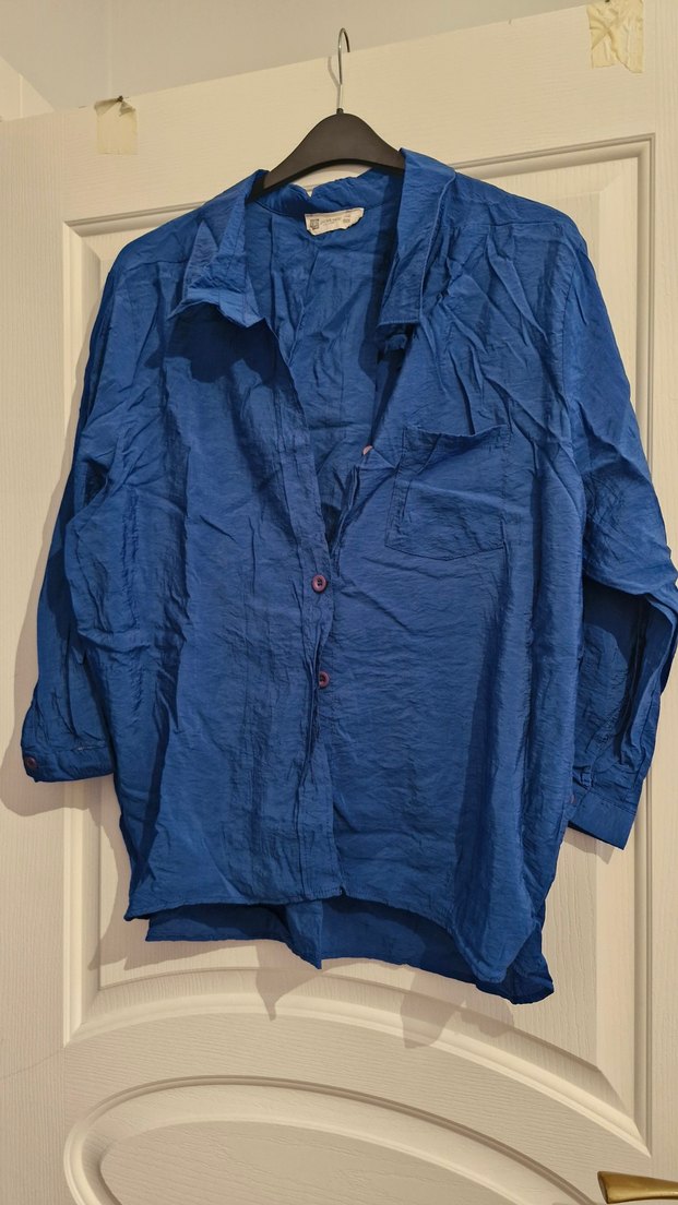Mavi renkli keten kadın gömlek, düğmeli ve uzun kolludur. Notlu yaka ve bol kesimiyle günlük sokak stiline uygundur.