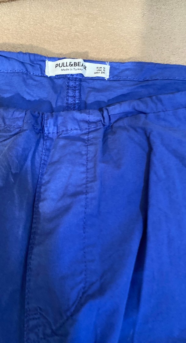 Parlak mavi keten kumaştan, düğmeli, bol kesim, midi boy pantolon. Günlük kullanım için uygundur.