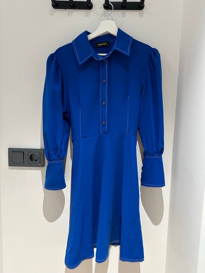 Mavi kısa elbise, uzun kollu, yakalı ve düğmeli detaylara sahiptir.