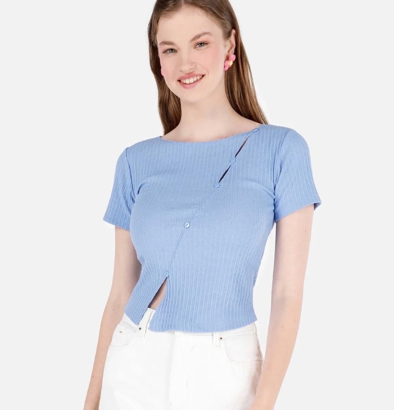 Mavi, düğmeli kısa kollu, V yakalı, normal uzunlukta ve yumuşak denim kumaştan yapılmış dar kesim bluz. Günlük rahat sokak stili için uygun.