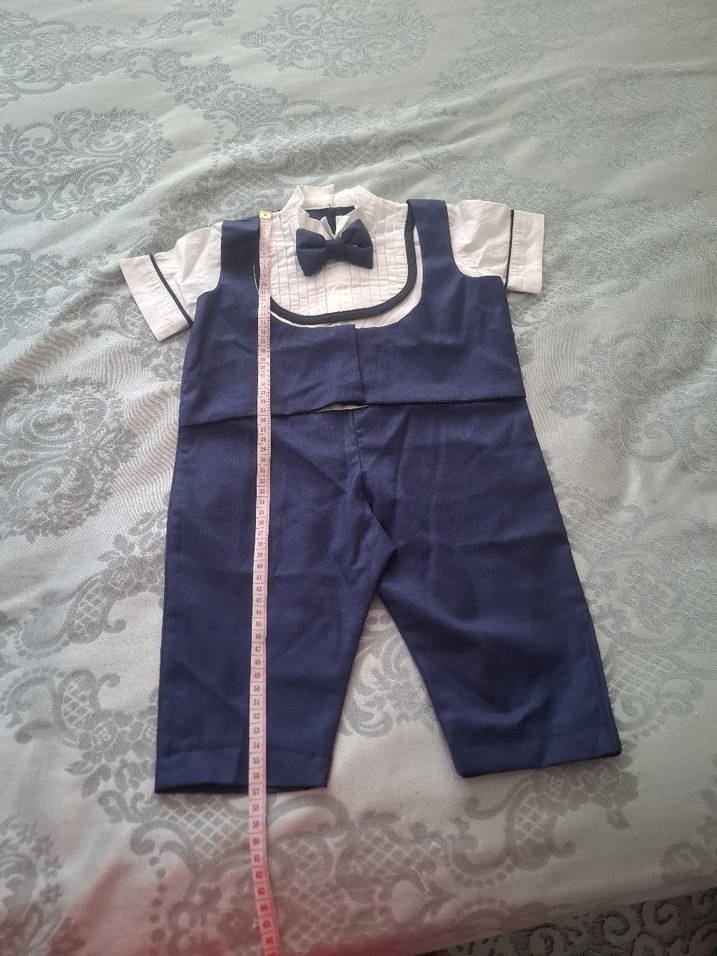 Düğmeli, kısa kollu ve kesik yakalı mavi çocuk takım elbisesi, rahat oturan şık bir tasarıma sahiptir. 0-3 ay kendinden bütün parçadır.