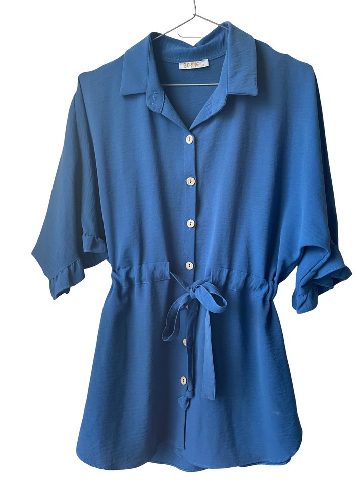 Kısa kollu, yakalı mavi keten gömlek, düğmeli ve bele bağlama detaylıdır. Rahat kesim ve parlak görünüme sahiptir.