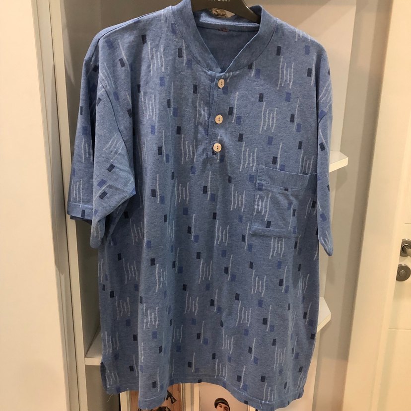 #düğmeli ve kısa kollu, mavi ve gri tonlarda desenli, bol kesim iki kol arası 60 boy 70