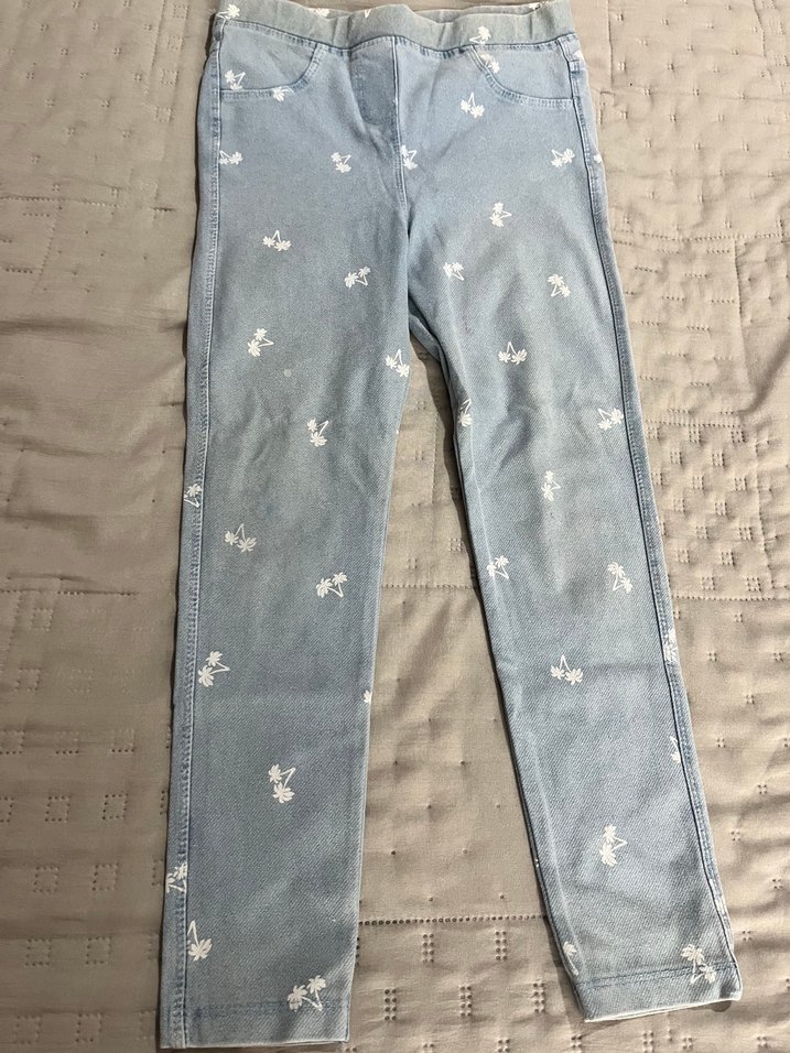 Mavi kot pantolon, küçük beyaz kelebek desenli ve düğmeli, trend bir günlük tarz sunar.