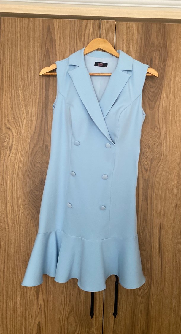 Mavi pastel renkte, kolsuz ve uzun kesim kadın takım elbisesi. Düğmeli ve kesik yakalı, normal kesim ve volanlı etek ucu ile ofis için uygundur.