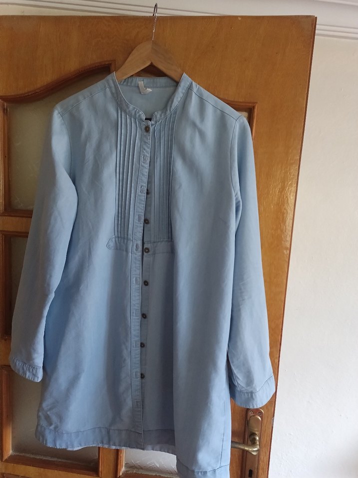 Düğmeli, uzun kollu, kot kumaştan yapılmış, mavi pastel renkte, midi boyda, salaş kesim gömlek. Günlük kullanıma uygundur.