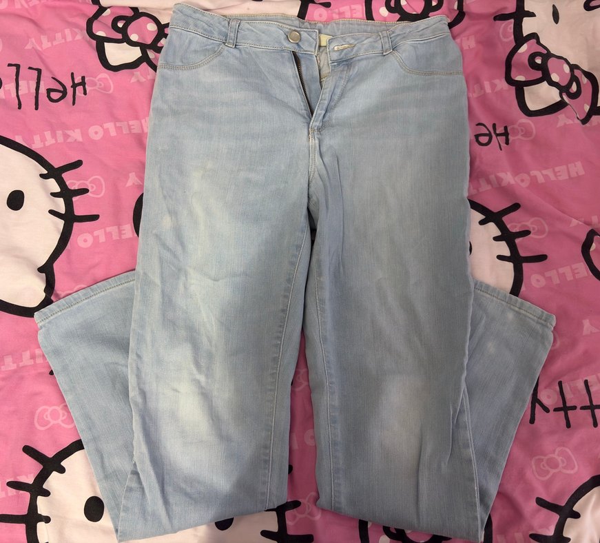 Pastel mavi renkte, düğmeli ve dar olan bu denim pantolon günlük kullanım için rahat ve şık bir tercihtir.