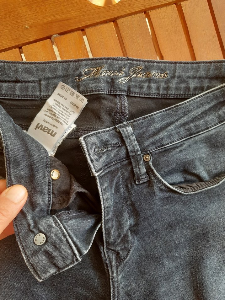 Düğmeli, koyu mavi denim pantolon, normal midi boyda ve dar kesim, günlük rahat kullanım için uygun.