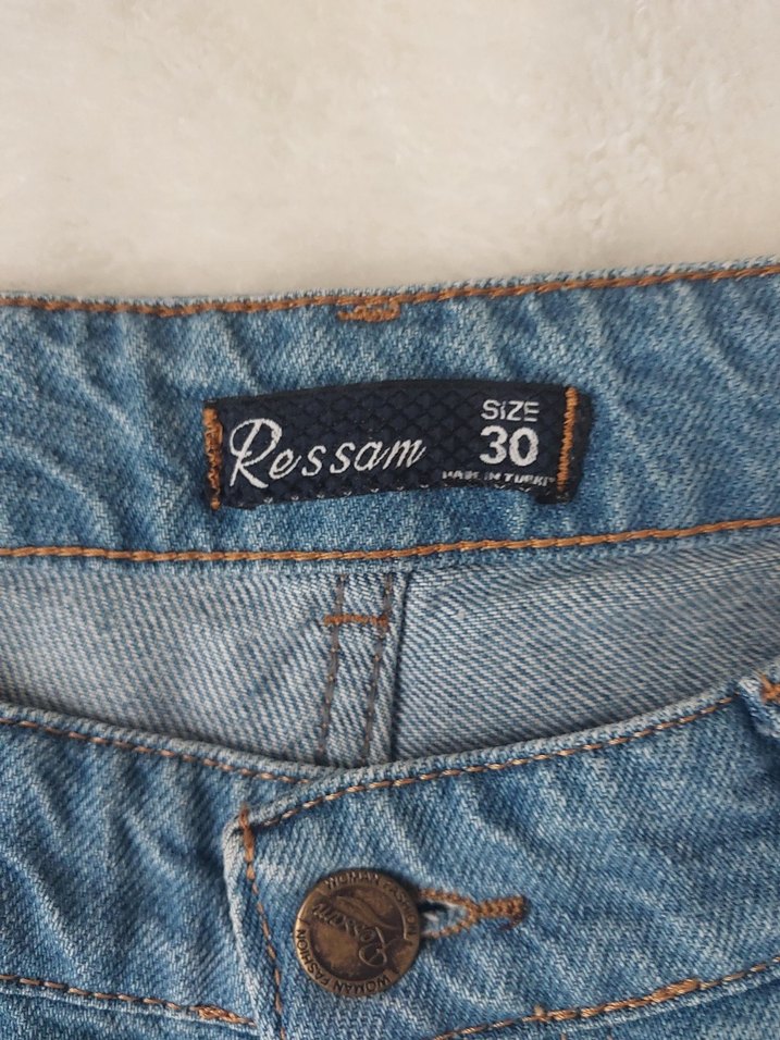 Düğmeli ön kısmı ve baskılı desenli, mavi renk loose fit kadın denim jean. Günlük rahat sokak stili için uygun. beden 30. Yüksek bel . uzunluğu 100 cm