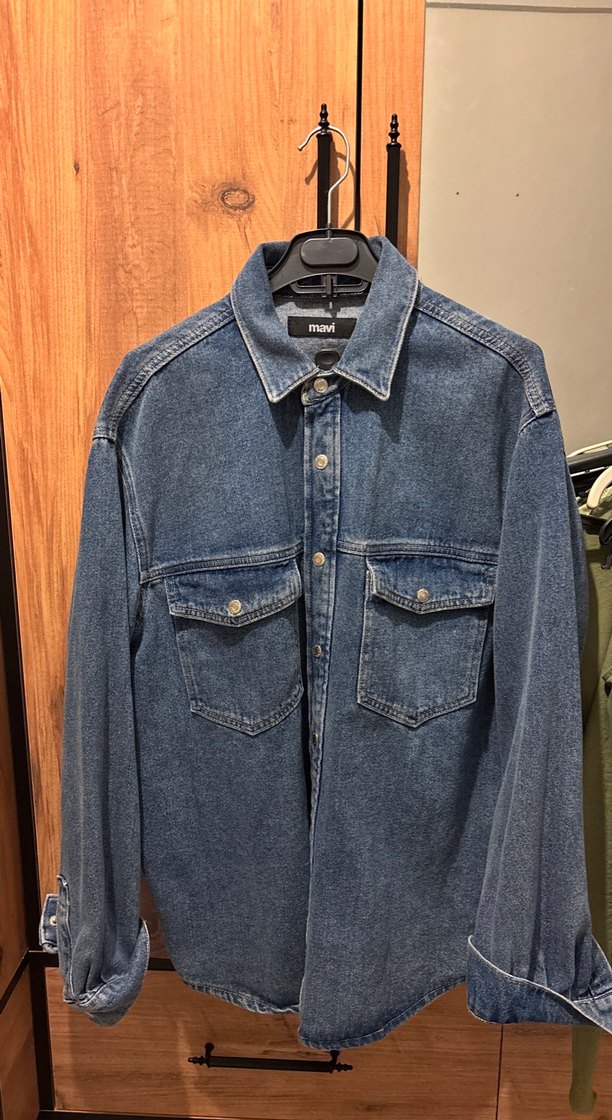 Mavi renk, uzun kollu, düğmeli ve notched lapel yakalı bol kesim denim ceket. Günlük sokak stili için uygun mavi marka