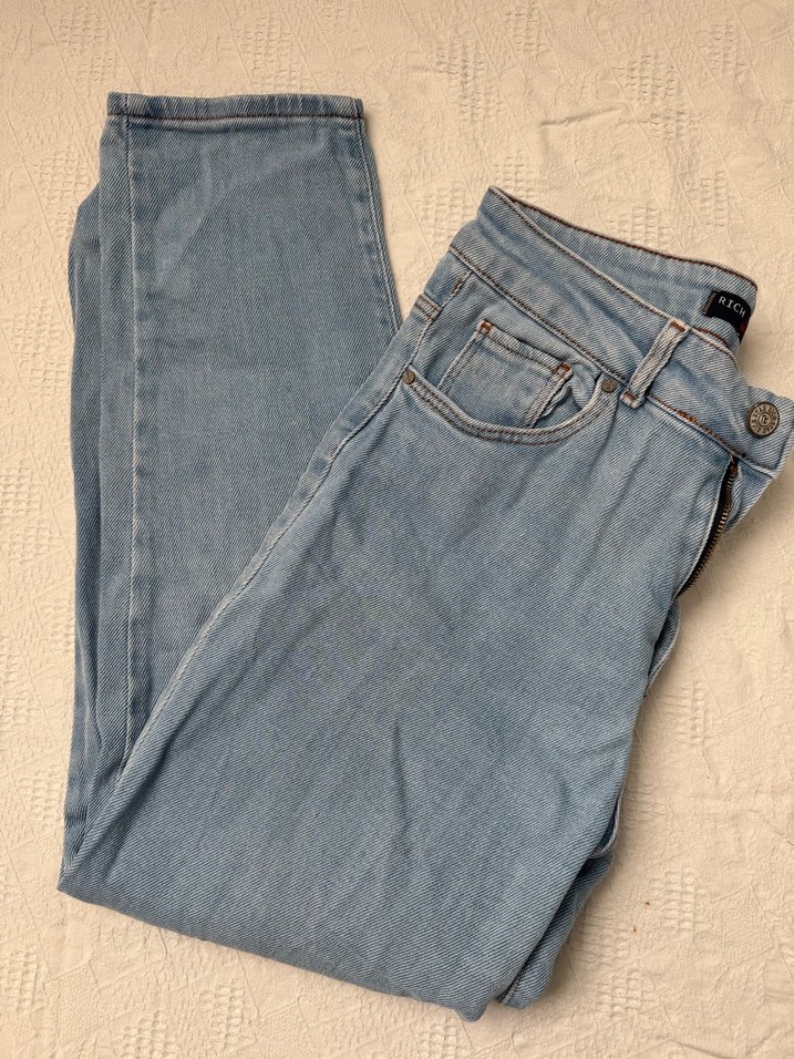 Mavi düğmeli midi uzunlukta, regular fit kadın denim jean. Pastel tonları ve sade tasarımıyla günlük rahat stil için uygundur.