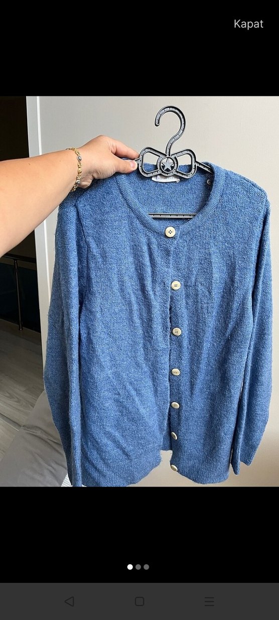 Mavi renkli, düğmeli, yuvarlak yakalı ve uzun kollu örme hırka; bol kesimiyle rahat ve şık bir günlük kullanıma uygundur.