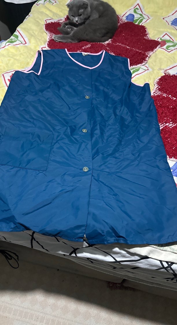 Düğmeli, mavi renkte, kolsuz, yaka ve kol kenarlarında açık renk detayları bulunan mutfak önlüğü. İş önlüğüde yapılır