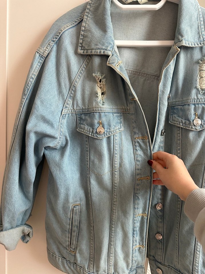 Açık mavi tonlarda, düğmeli ve oversize kesim denim ceket. Notlu yaka ve askılı kol detaylarıyla günlük kullanıma uygun.