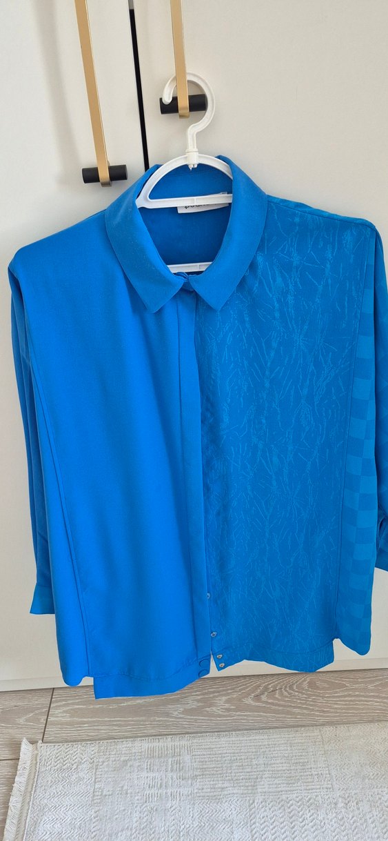 Kadın gömleği, düğmeli uzun kollu ve yakalıdır. Gevşek kesim, normal midi boy ve parlak mavi, ipeksi kumaştan üretilmiştir. Tek tarafında hafif dokulu desenler bulunur, çağdaş ve iş stili için uygundur.