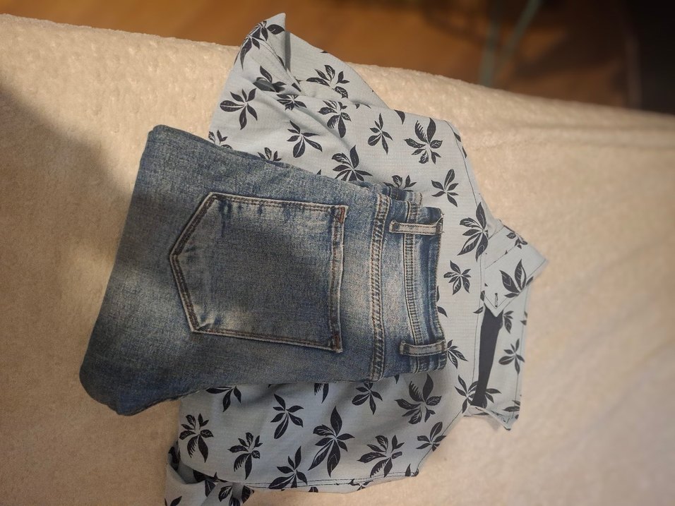 mavi renkte, düğmeli detaylara sahip, rahat kesim erkek kot pantolon. Günlük kullanıma uygun, desensiz tasarım sunar.gömlekli takım