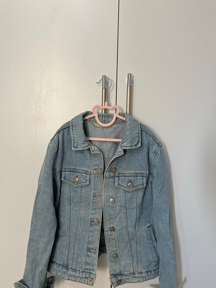 Mavi renkte, düğmeli ve rahat kesim kadın kot ceket. Notlu yaka ve uzun kollu, günlük kullanıma uygun.