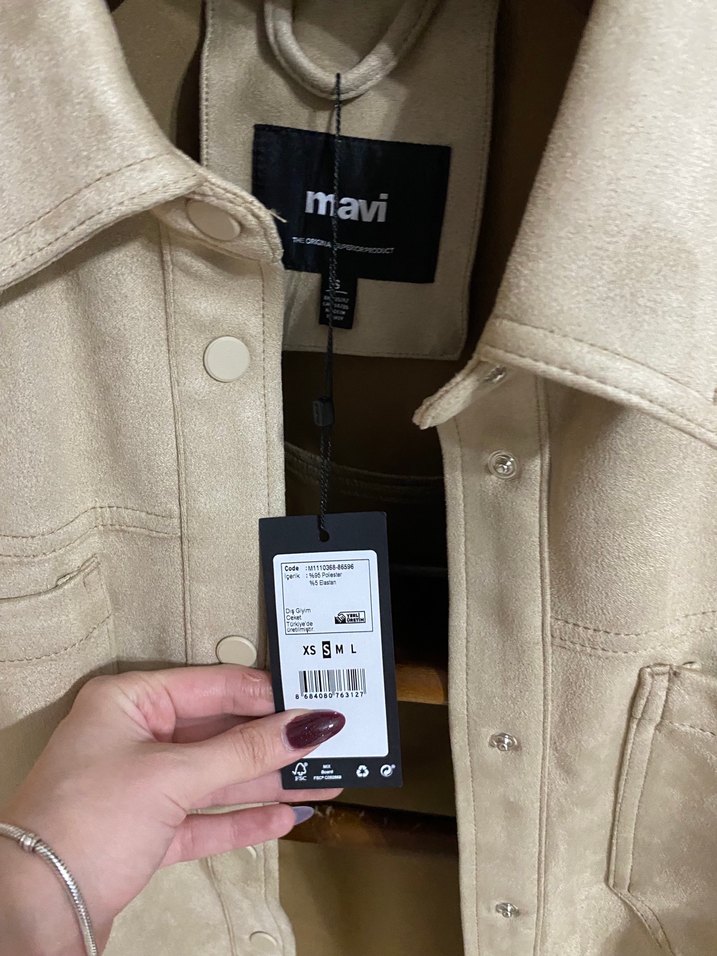 Bej renkte süet dokuda. Oversize bir yapısı var uzun kollu ve düğmeli etiketi duruyor hiç kullanılmadı sıfır